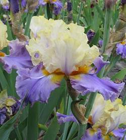 Ирис высокий бородатый Mist Arising (Мист Эрайзин). Стандарты светло-лимонные с лавандовой центральной жилкой. Фолы лавандовые с золотистыми плечиками. Бородка оранжевая с большим лавандовым лепестком. Красивая гофрировка, великолепная необычная форма. Срок цветения поздний. Высота 91 см.