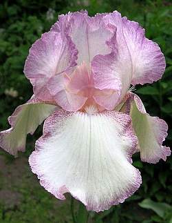 Ирис Mod Mode (Мод Моуд). Цветок белый с розовой гофрированной каймой. Изящный. Высота 70 см. Срок цветения средний.