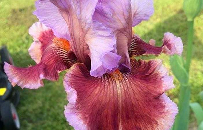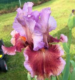 Ирис высокий бородатый More Please (Мо Плиз). Стандарты светло-лиловые, фолы коричневато-розовые, на плечиках ярче. На плечиках лиловая кромка. Бородка мандариновая. Красиво гофрирован, необычно сочетание цветов. Срок цветения средне-ранний. Высота 86 см.