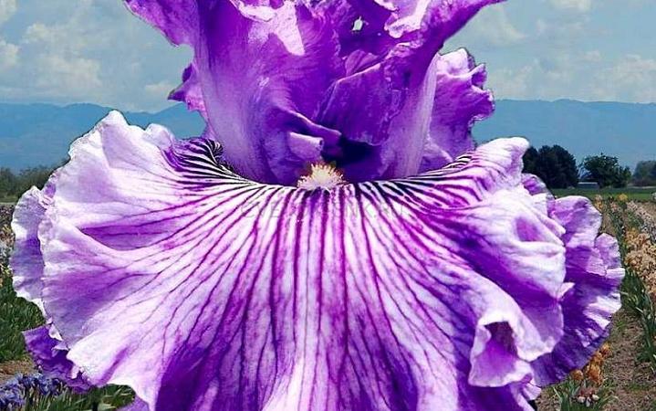 Ирис высокий бородатый Mulberry Magic (Малберри Мэджик). Стандарты и фолы ярко-лиловые, на фолах яркий рисунок из прожилок. Бородка мандариновая с переходом в белу. Очень нарядный, гофрированный. Высота 89 см.