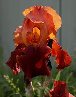 Ирис бородатый Natchez Trace (Натчез Трейс). Фолы красно-коричневые, с красивой гофрировкой, стандарты лососевые. Бородка желтая. Высота 80 см. Неприхотлив, строен и обильно цветет, легко разрастается. Необычайно красив в массивах.