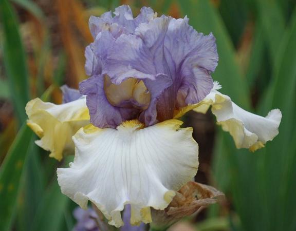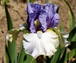 Ирис высокий бородатый Now Playing (Нау Плэйин). Сорт с невероятной окраской. Реверс. Стандарты голубые, сиреневатые, с серебристым отливом. Фолы белые с голубоватым отблеском и желтыми плечиками. Бородка белая. Гофрировка очень красивая. Срок цветения средне-ранний. Высота 97 см.