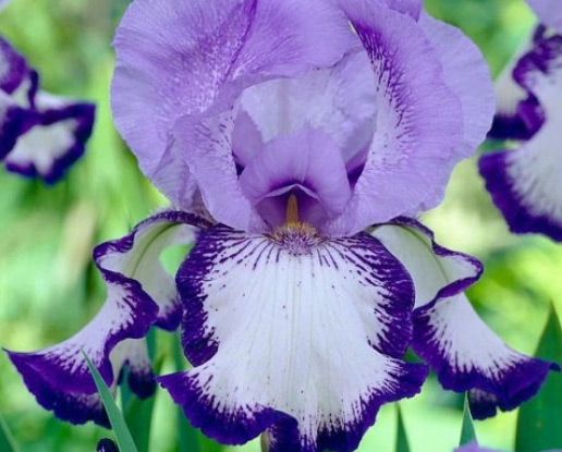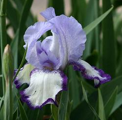 Ирис бородатый On Edge (Он Эдж). Неприхотливый сорт. Окраска нежная и привлекательная. Стандарты светло-голубовато-сиреневые, фолы белые с яркой фиолетовой каймой. Бородка охряно-желтая с сиреневым кончиком. Легко разрастается, обильно цветет.