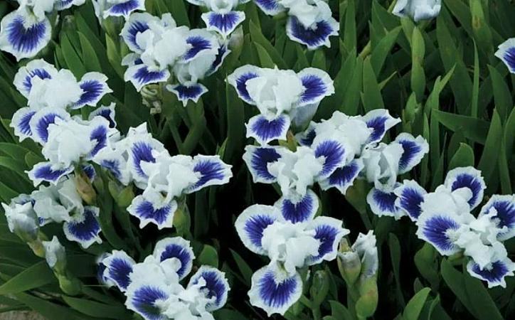 Ирис бородатый карликовый Open Your Eyes (Опен ё Айз). Очень ароматный ирис со средне-поздним цветением и чисто-белыми стандартами. Белые фолы с большим темно-синим пятном с бахромчатыми краями, бородка белая. Награда за качество, 2014 г. Медаль Кука-Дугласа, 2016 г.