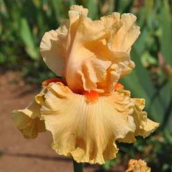 Ирис высокий бородатый Orange Music (Оранж Мьюзик). Стандарты и фолы цвета спелого абрикоса. Бородка широкая, мандариновая. Имеет мускатный аромат. Гофрировка очень красивая. Нарастает быстро. Высота 91 см. Срок цветения средне-поздний.