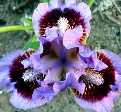 Ирис бородатый карликовый Parade Lap (Парейд Лэп). Стандарты лиловые. Фолы с большим красновато-бордовым пятном вокруг бородки. Около бородки лиловые лучики. Бородка лавандовая с бордовым. Срок цветения ранний. Высота 30 см.