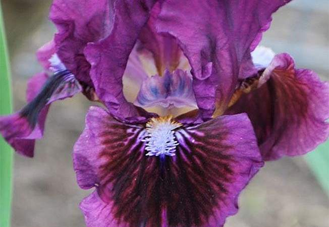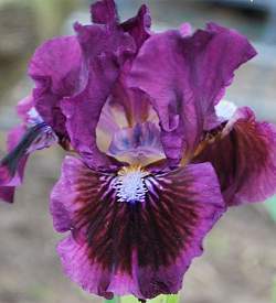 Ирис бородатый карликовый Pepi (Пепи). Стандарты темно-пурпурные. Фолы пурпурные с рубиновым напылением в центре. Бородка серовато-желтая с лавандовым окончанием. Срок цветения средне-ранний. Высота 28 см.