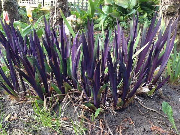 Ирис пестрый Dark Aura (Дарк Аура) — необычный ирис. Имеет привлекательные фиолетовые листья. Цветки также фиолетовые, появляются на почти черном стебле. Общий эффект потрясающий. Листья линейные, одна сторона листа зеленая, другая — фиолетовая. Легко разрастается, неприхотлив.