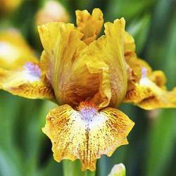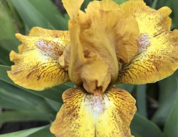 Ирис карликовый Пивовар. Стандарты медово-горчичные. Фолы медовые с коричневатой пликатой. Обратите внимание, какая необыкновенная бородка — белая подушечка с разбросанными по ней горчичными брызгами! Во время цветения похоже на золотую поляну. Срок цветения средний. Высота 35 см.