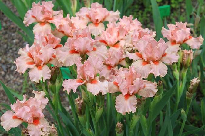Ирис бородатый карликовый Portland Pink (Портлэнд Пинк). Уникальный по окраске, великолепный, яркий. Стандарты розовые. Фолы персиково-розовые с коралловым. Бородка красно-оранжевая, очень яркая. Срок цветения поздний. Высота 38 см.