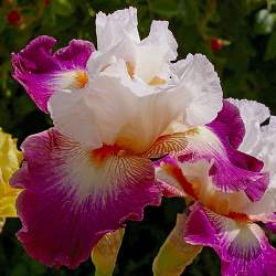 Ирис Prince Eugene (Принс Эжен). Потомок сорта "Орели" ("Aurélie") с очень красивым "вкусным" цветом. Стандарты белые. Фолы бело-бежевые с широкой светло-малиновой каймой. Бородка ярко-коралловая. Цветоносы хорошо разветвлённые, несут в среднем по 9 бутонов. Цветение длительное.