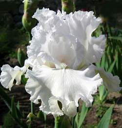 Ирис бородатый Pure as The (Пьюэ эс Зе). Белый, сильно гофрированный. Бородка белая с желтоватыми кончиками. Цветок с сиреневатым оттенком. В 1994 г. отмечен наградой за качество.