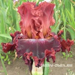Ирис высокий бородатый Пьяная Вишня. Стандарты вишнево-коричневые, фолы черно-вишневые с каймой цвета стандартов. В зоне бородки высветление с черно-вишневым жилкованием. Бородка бронзовая. Шикарно гофрирован, кружевной, широкий, крупный. Высота 80 см. Срок цветения средний.