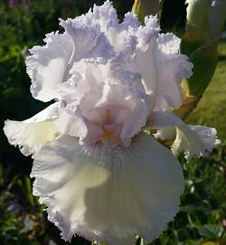 Ирис высокий бородатый Queen of Angels (Квин оф Энджелс). Цветок белый с легким лавандовым оттенком. Бородка желтая с белым кончиком. Очень красивая бахромчатая гофрировка. Высота 91 см. Срок цветения поздний.