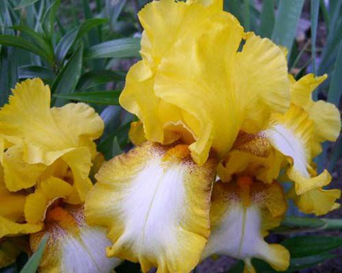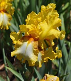 Ирис Radiant Apogee (Радиант Апогей). Цветок яркий, эффектный, с красивой гофрировкой. Стандарты ярко-желтые, фолы белые с золотой каймой и бронзовым напылением в области бородки.
