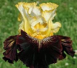 Ирис высокий бородатый Reckless Abandon (Реклесс Эбендон). Стандарты золотисто-желтые с белыми жилками. Фолы винно-черные со светлыми жилками у бородки. Бородка желтая. Окраска броская, необычная. Красиво гофрирован. Срок цветения средний. Высота 97 см. Имеет награды.