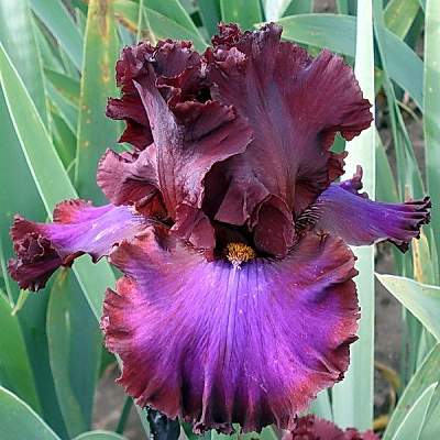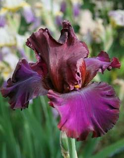 Ирис высокий бородатый Red Handed (Ред Хендид). Стандарты цвета махагон. Фолы пурпурно-фуксиновые с махагоновой каймой. Бородка желтая. Великолепная гофрировка. Высота 84 см. Имеет награды.