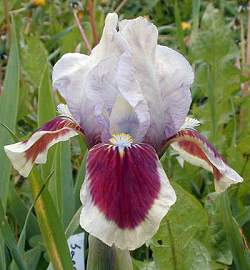 Ирис Red Heart (Ред Харт). Нижние лепестки с шоколадно-красным глазком и широкой светло-желтой каймой, верхние — бело-сиреневые.