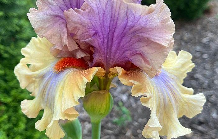 Ирис высокий бородатый Restless Spirit (Рестлес Спирит). Стандарты чернично-фиолетовые с пепельным напылением по краю. Фолы серовато-бежевые с бежевыми плечиками. В центре высветление с фиолетовыми жилками. Бородка охряно-оранжевая. Необычный, гофрированный, привлекательный! Срок цветения средне-ранний. Высота 91 см.