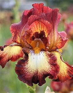 Ирис Ride Joy (Райд Джой). Стандарты с жёлтым напылением, фолы бордовые с большим жёлтым пятном. Растение высотой до 90 см. Период цветения: май-июнь. Цветок крупного размера (до 16 см). Зона зимостойкости: 4. Неприхотлив, легко разрастается. Надежный сорт, подходит для массивов.
