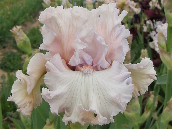 Ирис высокий бородатый Rite of Passage (Райт ов Пэссидж). Стандарты жемчужно-розовые, пенные. Фолы — бленд жемчужно-розового и голубоватого. Бородка мандариновая с голубым кончиком. Непередаваемые оттенки. Плотный, кружевной, гофрированный, нежнейшей окраски. Срок цветения средне-поздний. Высота 102 см.