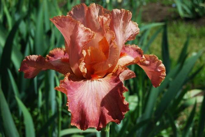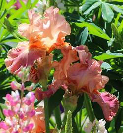 Ирис Role Model (Роул Модел). Стандарты жёлто-розовые с персиковым отливом, фолы темнее, со светлым пятном в центре; бородки оранжевые. Гофрированный. Высота цветоноса 90 см Срок цветения средне-ранний. Ароматный.