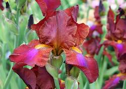 Очень привлекательный цвет. Основной тон стандартов и фолов коричневато-красный, на фолах ярко-фуксиновое пятно, на фоне которого выделяется бородка мандаринового цвета.