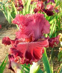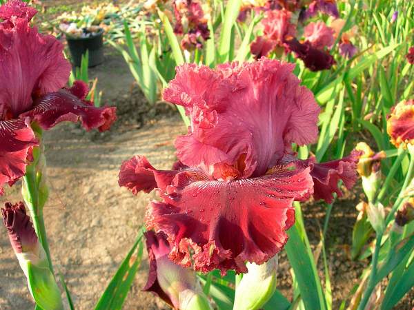 Ирис высокий бородатый Рубиновая Свадьба. Очень красивый, кружевной. Стандарты красновато-вишневые, фолы густо-вишневые, бархатистые с белым жилкованием. Бородка мандариновая. Фолы парящие. Срок цветения средне-ранний. Высота 98 см.
