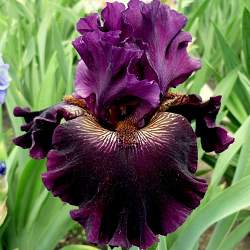 Ирис высокий бородатый Ruby Torch (Руби Торч). Стандарты цвета бургунди, фолы темнее стандартов, бархатистые. В области бородки ярко-желтое пятно. Бородка бронзовая. Красивая гофрировка. Высота 91 см.