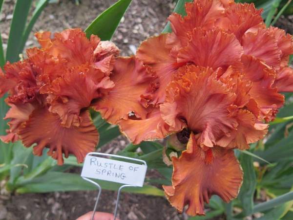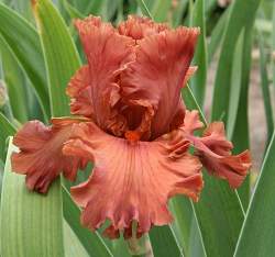 Ирис высокий бородатый Rustle of Spring (Расл оф Спринг). Ровного тона, рыжий с терракотовыми и красными тонами. Цветок очень красиво сложен, гофрирован. Бородка мандариновая. Высота 86 см.