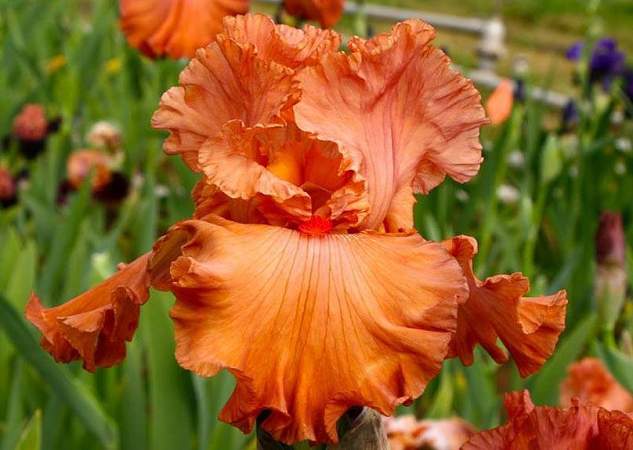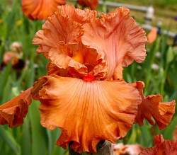 Ирис высокий бородатый Rusty Taylor (Расти Тейлор). Стандарты и фолы ярко-оранжевые с мандариновым оттенком. Бородка оранжевая, на кончике красная. Броский, активный, хороший акцент в цветнике. Красивая гофрировка. Срок цветения средне-ранний. Высота 94 см.
