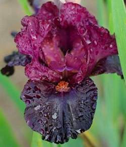 Ирис Sangria (Сангрия). Парящий, гофрированный. Стандарты цвета темный бургунд. Фолы бархатные красно-черные. Бородки темно-фиолетовые, кончики цвета сирени. Высота 55 см. Интермедиа. Срок цветения средний.