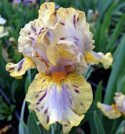 Ирис бородатый карликовый Scoundrel (Скаундрел). Вариативный по окраске сорт. Стандарты зеленовато-желтые с темно-фиолетовыми крапинами. Фолы оливкового оттенка; по центру светло-фиолетовое напыление; частый фиолетовый крап. Высота 28 см. Срок цветения средне-поздний.