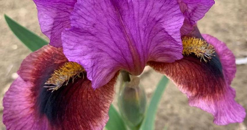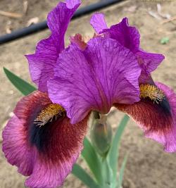 Ирис бородатый карликовый Shimmy Shake (Шимми Шейк). Стандарты пурпурные с более темными прожилками. Фолы розовато-фиолетовые с большим черным сигналом, который к краям краснеет. Срок цветения средний. Высота 41 см. Цветок — очарование!