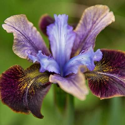 Ирис сибирский Black Joker (Блэк Джокер). Сибирский ирис с необычной окраской. Фолы коричневато-пурпурные с золотой каймой, стандарты от голубого до лавандового. Цветоносы высотой 50 см. Цветение в июне. Место солнечное, почва влажная.