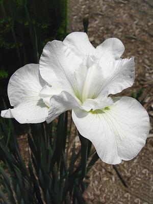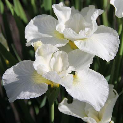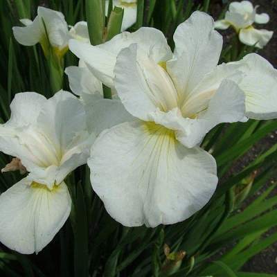 Ирис сибирский Gull's Wing (Галс Винг). Большие, слегка кружевные, чисто белые цветы с жёлтыми сигналами, слегка гофрированные. Высота 90 см.