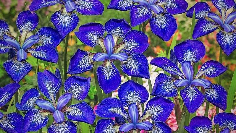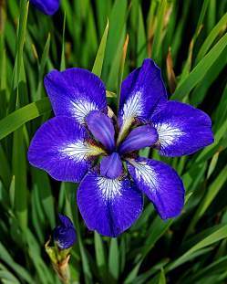 Ирис сибирский I see Stars (Ай си Старз). Синие цветки с белыми глазками на нижних лепестках и сетью темно-синих прожилок напоминают звезды, что сияют на ночном небе. Цветение начинается в июне-июле, многолетник сохраняет декоративность весь сезон.