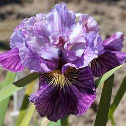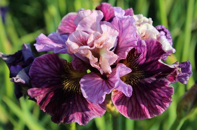 Ирис сибирский Peacock Mad Hat (Пикок Мэд Хэт). Ирис с фантастической окраской - стандарты переливчатые, розово-лавандовые с пурпурными прожилками, фолы темно-пурпурные с желтым сигналом. Ирис Мэд Хэт отличается сильно гофрированными, будто махровыми стандартами. Цветок смотрится как экзотическое чудо. Высота 80 см. Цветет в течение трех недель.