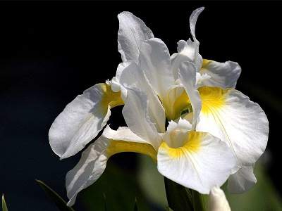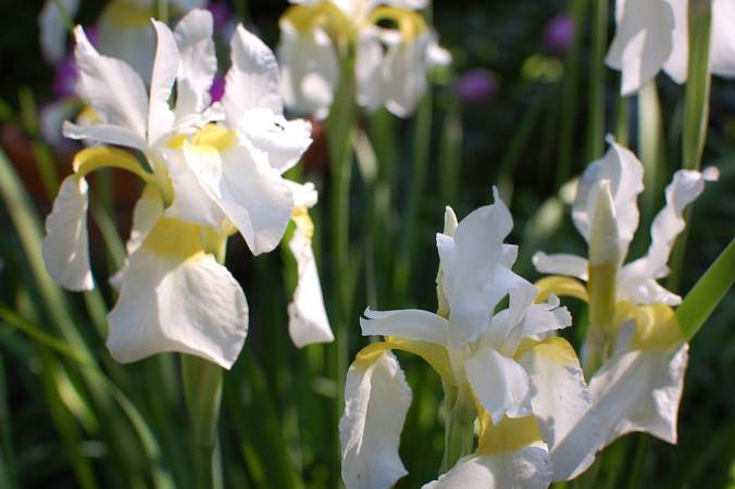 Ирис сибирский Snow Queen (Сноу Квин). Высота 45-60 см. Стандарты белые, фолы белые с желтым пятном у основания. Лепестки парящие. Цветет в июне.
