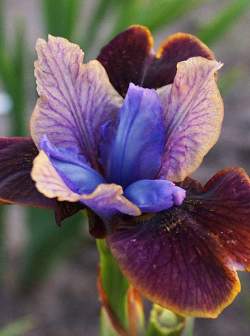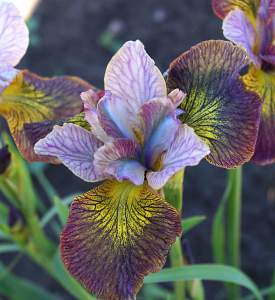 Ирис сибирский Unbuttoned Zippers (Анбатонд Зипперс). Окраску этого ириса даже трудно описать. Выразительность рисунка подчеркивает тонкая золотая кайма по краю фолов. Стандарты испещрены жилками. Необыкновенная нюансная игра цвета.