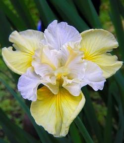 Ирис Yellow Tail (Йеллоу Тейл). Цветок крупный, золотисто-желтый с белыми верхними долями. Гофрированный. Высота 75 см. Диаметр цветка 16 см. Цветение в июне.