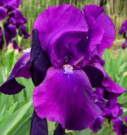 Ирис Sign of Leo (Сайн оф Лео). Фиолетовый с белыми прожилками у центра, бородка жёлтая. Лепестки слегка гофрированные. Высота растения 80 см. Цветение — май-июнь. Легкий в уходе.