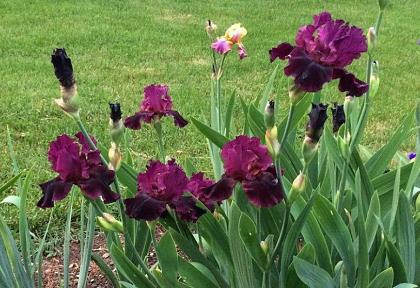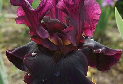 Ирис высокий бородатый Silken Trim (Силкен Трим). Стандарты фуксиново-пурпурные, фолы пурпурные до черна. Бородка янтарная. Красивая шелковистая текстура, гофрировка. Срок цветения поздний. Высота 91 см. Имеет награды.