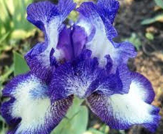 Ирис бородатый карликовый Starbaby (Старбэби). Стандарты белые с фиолетовой пликатой. Фолы такие же, плечики светло-каштановые. Бородка голубая с белым. Срок цветения ранний. Высота 35 см. Имеет награды.