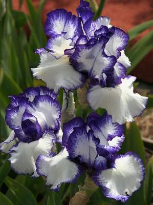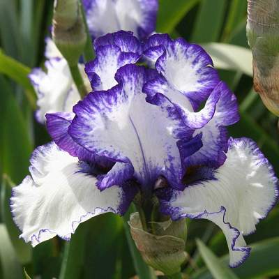 Ирис бородатый Stitch in Time (Ститч ин Тайм). Пликата с узкой темно-синей каймой по белому фону. Высота до 90 см. Листья сизые. Цветонос прочный, длиной до 90 см, коротковетвистый. Число цветков на цветоносе 5-6 шт., одновременно распустившихся 2-3 шт. Размер цветка: высота 10 см, ширина 16 см. Доли околоцветника широкие, округлые, волнистые. Не выгорает.