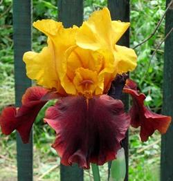 Ирис Supreme Sultan (Суприм Салтан). Верхние лепестки оранжевые с бордовыми прожилками, нижние — темно-бордовые. Еще одни популярнейший "Султан" наряду с хитом "Sultan's Palase". Цветок крупный, с волнистыми лепестками, яркий. в интересных желто-красно-коричневых тонах.