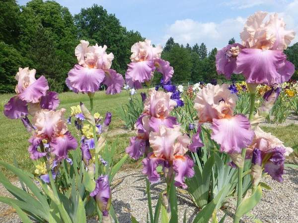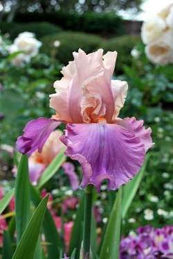 Ирис Sweet Musette (Свит Мюзетта). Стандарты светло-розовые с лавандовым блендом. Фолы розовато-лавандовые с белым пятном в основании. Бородка мандариновая. Красиво гофрирован. Высота 94 см. Срок цветения средне-поздний. Имеет награды.