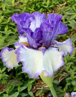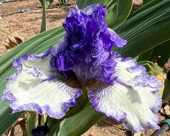 Ирис высокий бородатый Texas Two Step (Тексас Ту Степ). Стандарты белые, почти полностью покрыты фиолетово-голубым вливанием. Фолы белые с четкой кромкой стежками. Бородка желтая с белым рогом. Красивый, гофрированный, кружевной. Срок цветения средне-поздний. Высота 94 см.
