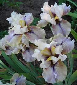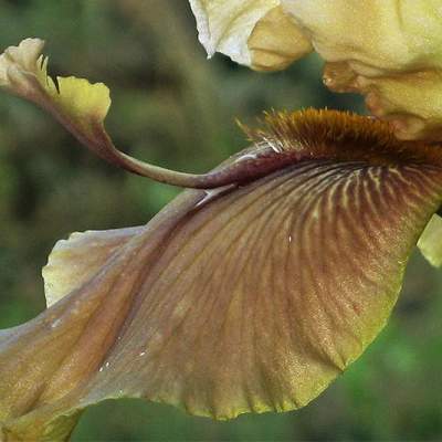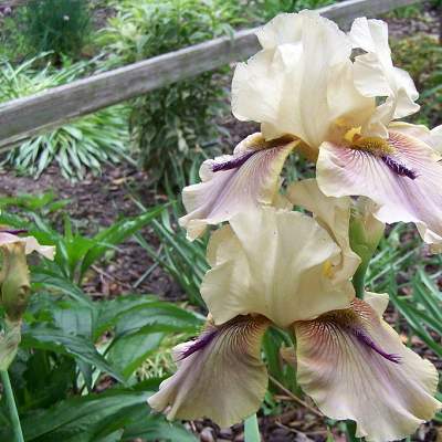 Ирис Thornbird (Торнбёрд). Светло-бежевые стандарты, фолы — зеленовато-горчичные с фиолетовыми жилками; горчичная бородка заканчивается фиолетовым "рогом" или маленьким лепестком. Лепестки гофрированные, фолы парящие. Срок цветения средний. Имеет награды.