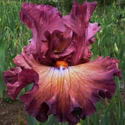 Ирис высокий бородатый Thundery (Тандери). Стандарты цвета бургунди, фолы бронзовые с синей вспышкой в районе бородки и широкой каймой цвета стандартов. Бородка темно-оранжевая. Имеет сладкий аромат. Срок цветения поздний. Высота 63 см. Необычный и очень богатый.